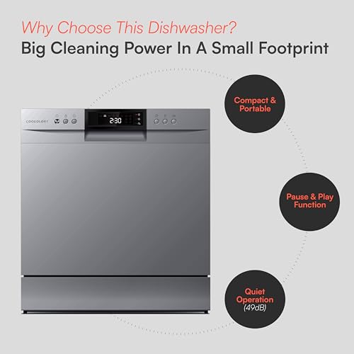 - MODERN STYLISH DESIGN: The attractive, modern design makes it suitable for your kitchen countertop, but you can also install it in a suitably sized cupboard, such as under the sink. This dishwasher runs quietly at a volume of only 49dB.