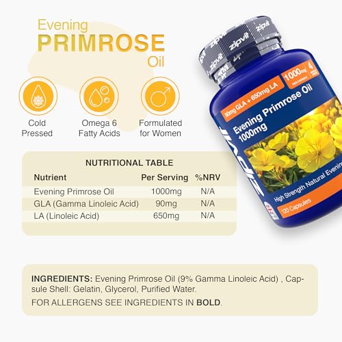 - RICH IN GLA – FOR BALANCE, COMFORT & CLARITY Each capsule delivers 1000mg of cold-pressed Evening Primrose Oil, providing 90mg of GLA – an Omega-6 fatty acid that supports the body’s production of prostaglandins, essential for maintaining menstrual comfort, hormonal harmony, and clear skin. GLA is also being studied for its role in cognitive function and skin elasticity.