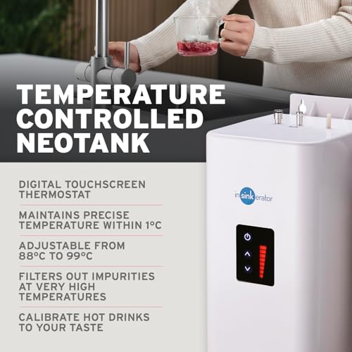 - PRECISE TEMPERATURE CONTROL: With the electronic, adjustable thermostat touch screen on the NeoTank hot water tank, users can calibrate the water temperature from 88 to 99 degrees C.