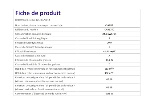 - High Energy Efficiency: CIARRA is committed to developing smarter, energy-saving appliances. CIARRA Class A+++ energy efficient cooker hood not only reduces your electricity bill by 80% every year but also brings you a high-quality ecological life.